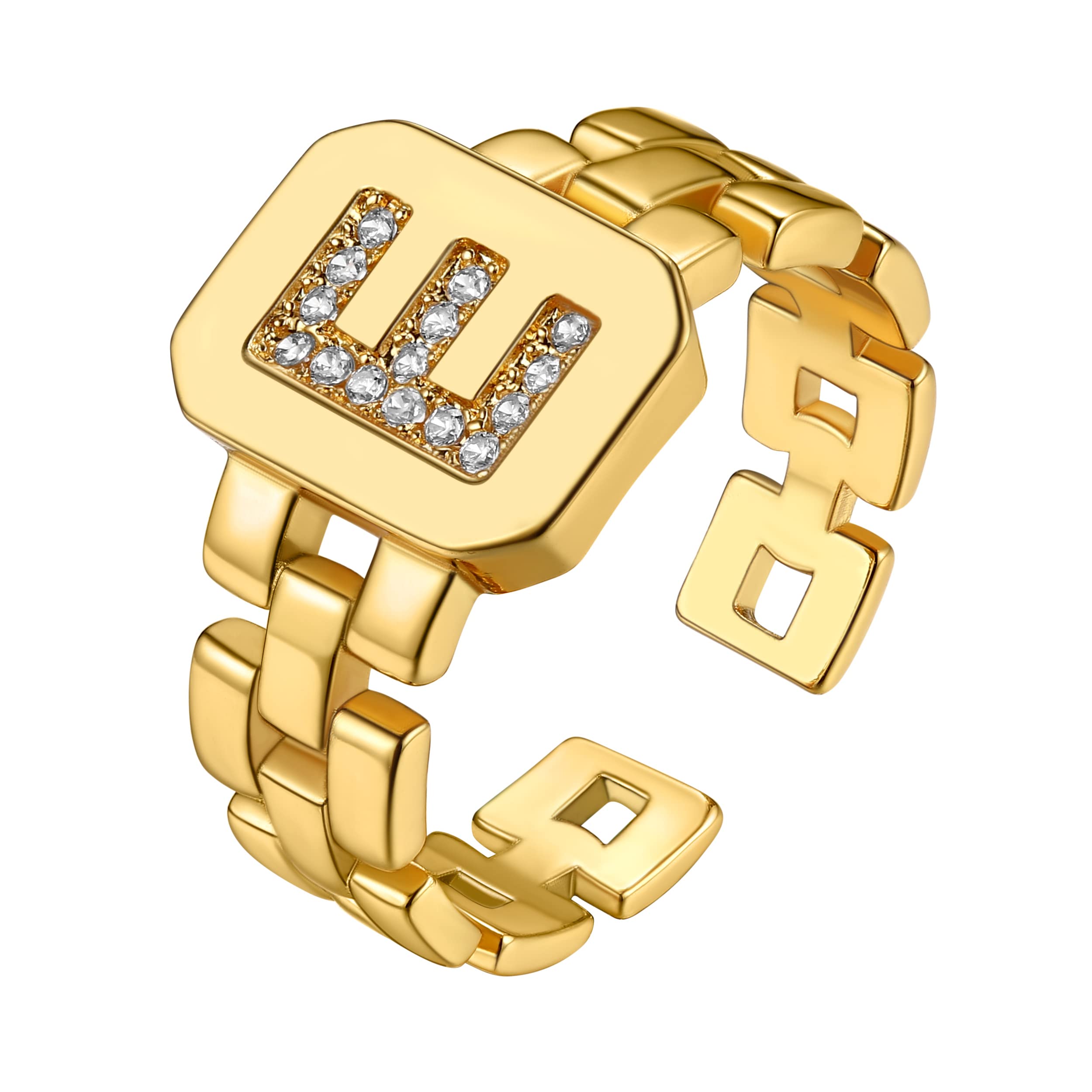 This KeyStyle initial ring crafted with 18k gold plating, boasts a sleek, polished finish. At the center of the top section, cubic zirconia stones are meticulously set to form an initial letter, which can be chosen from A - Z. The band itself has a geometric, interlocking link design, giving it a contemporary look. It's adjustable, perfect fit for any finger size, making it a versatile and comfortable option for both men and women, this ring makes a thoughtful gift for loved ones, including mothers, fathers, siblings, partners, and friends. Perfect for special occasions like Mother��s Day, Valentine��s Day, anniversaries, and birthdays, it��s a memorable piece of jewelry that adds a personal and meaningful touch to any celebration.